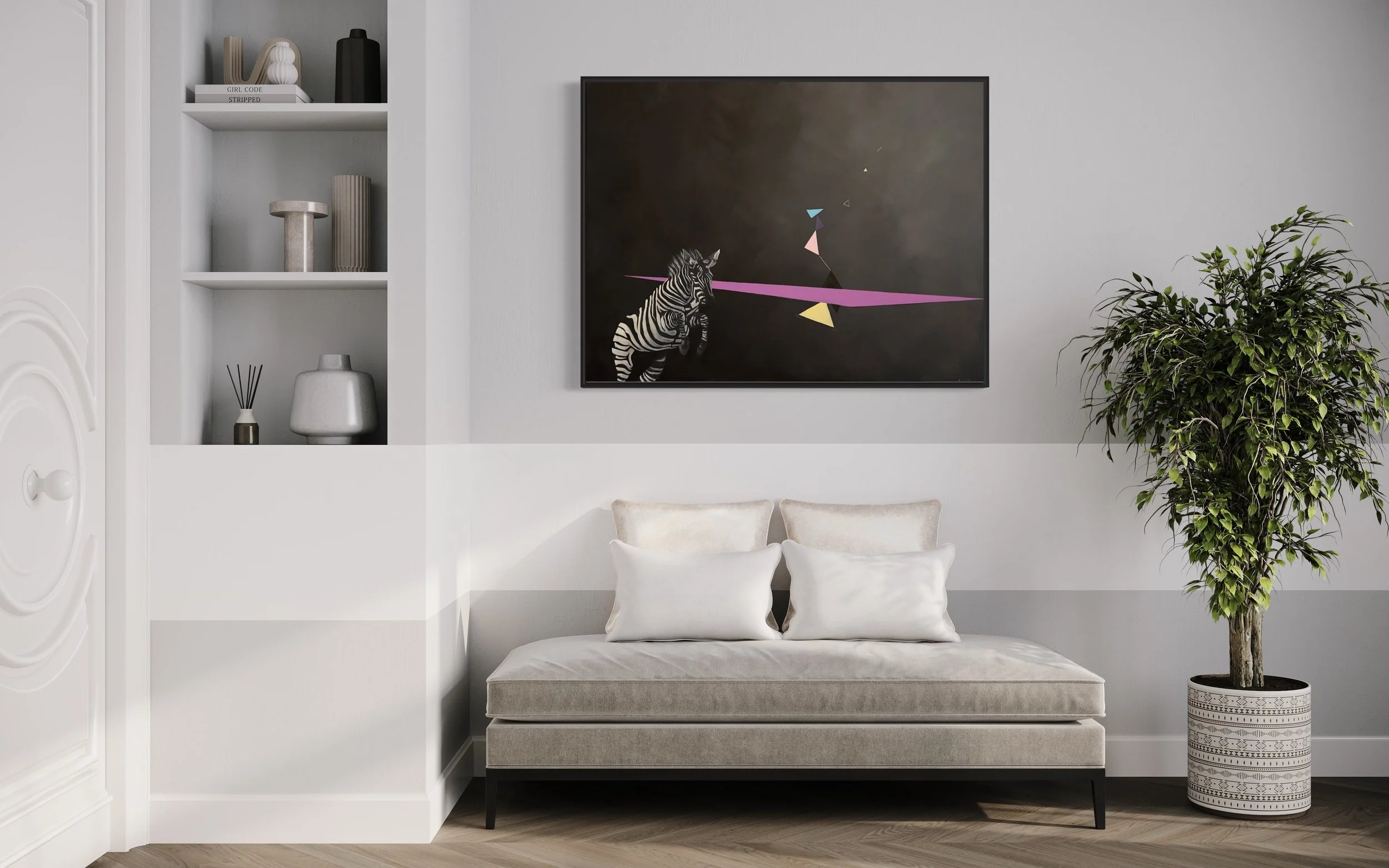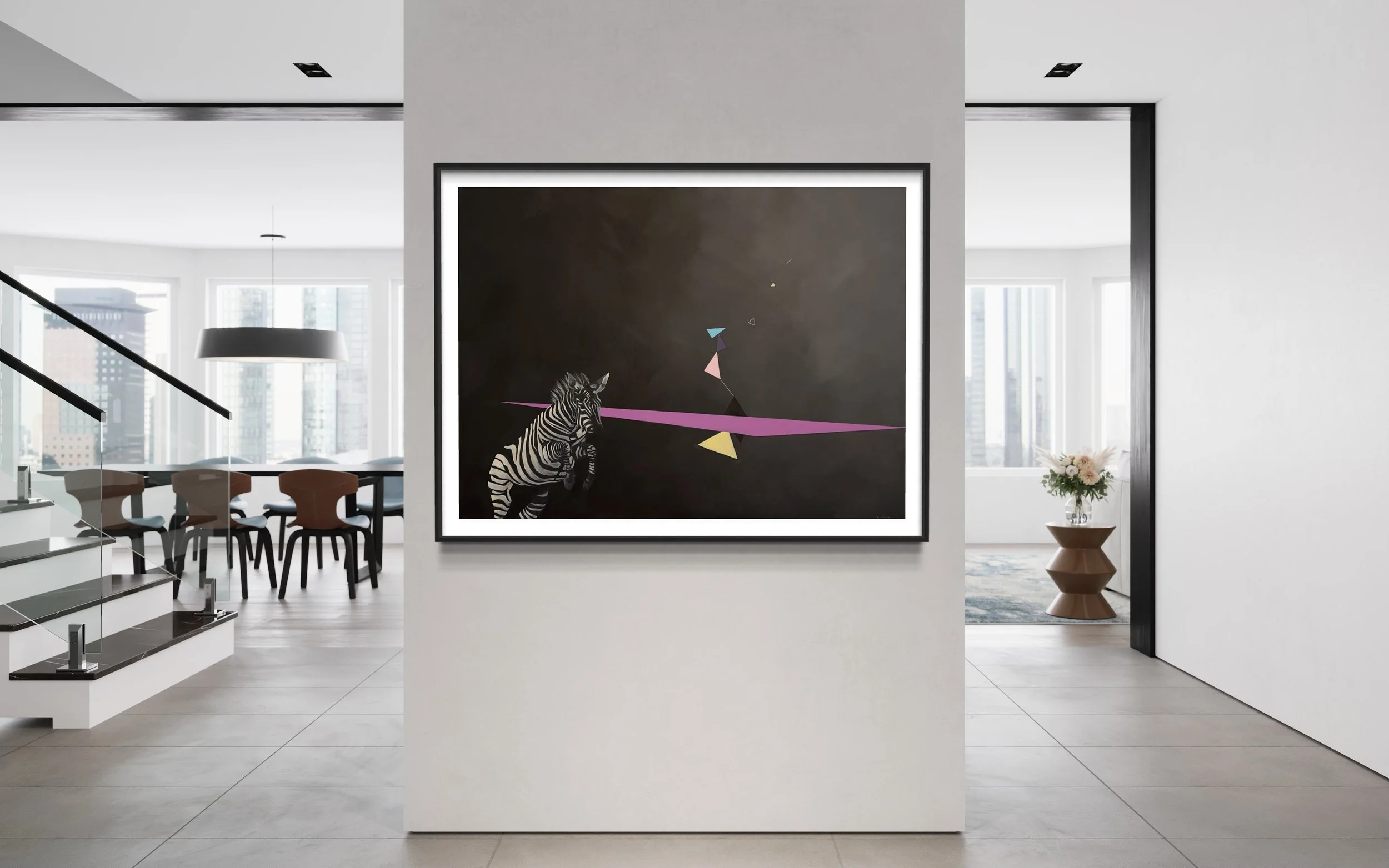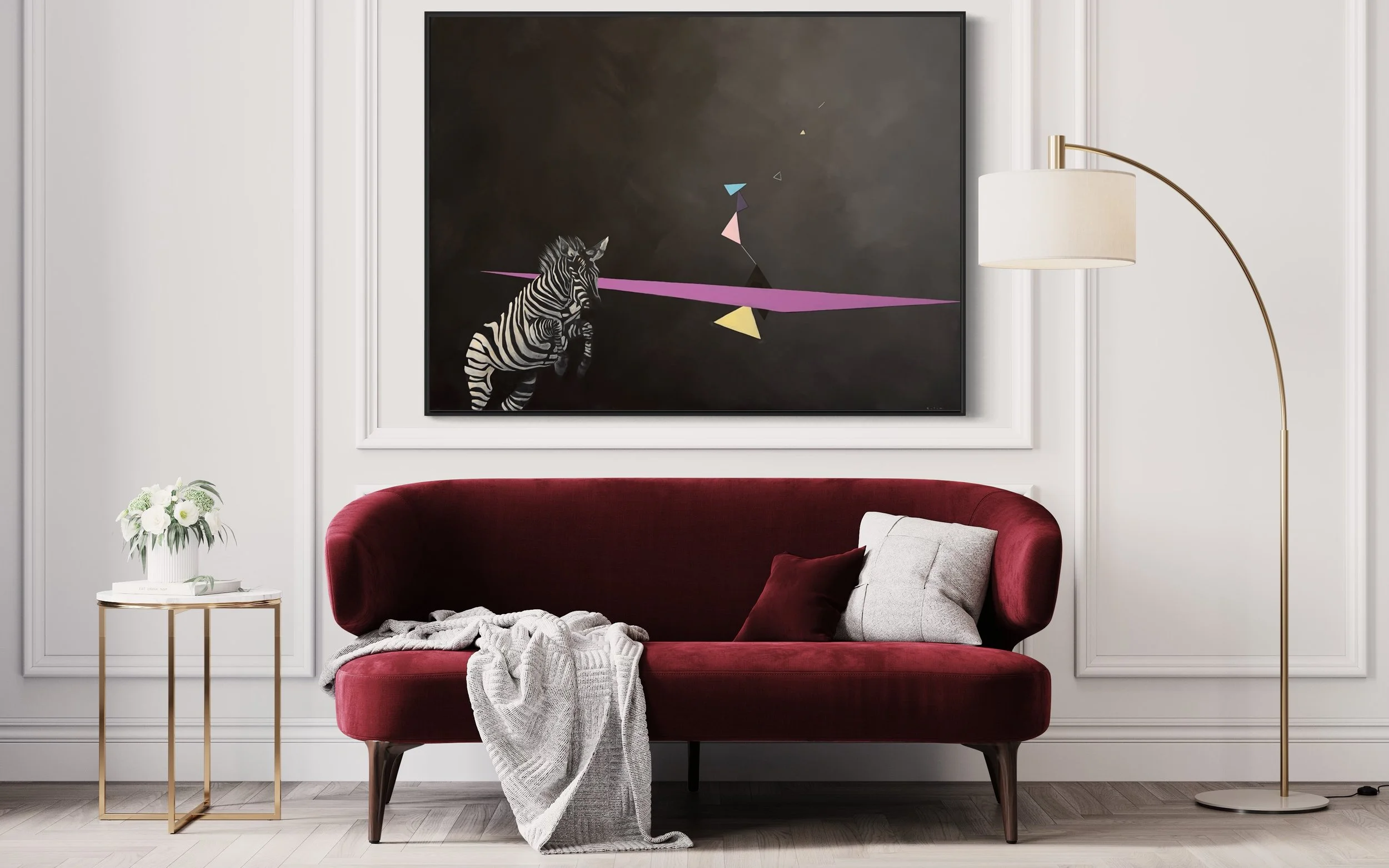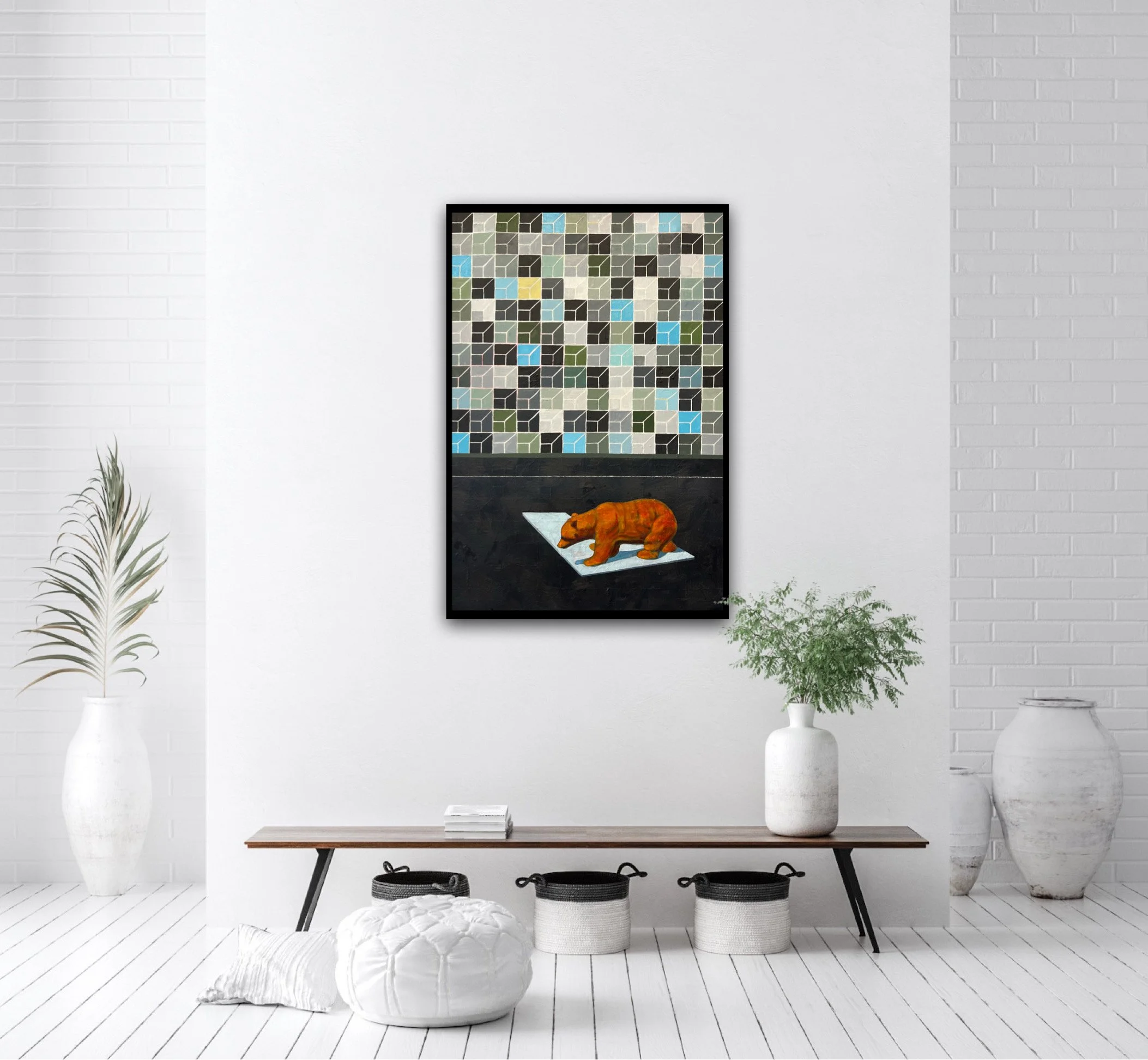 Oil and was on Canvas, 41.5”x61.5”x1.5”. Framed in black floater, ready to hang